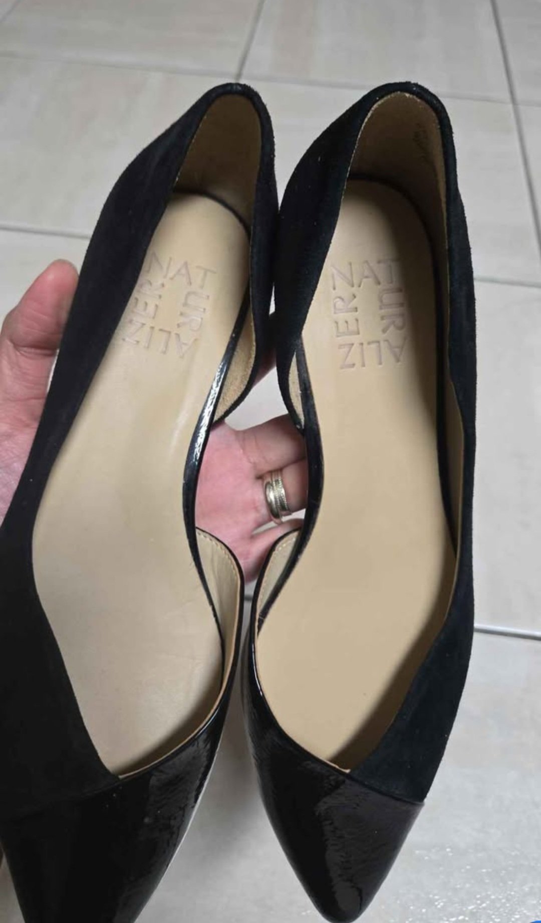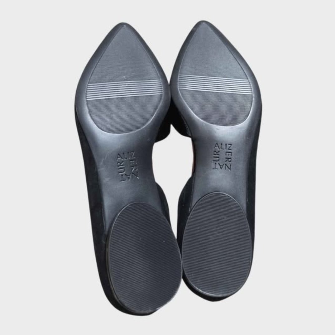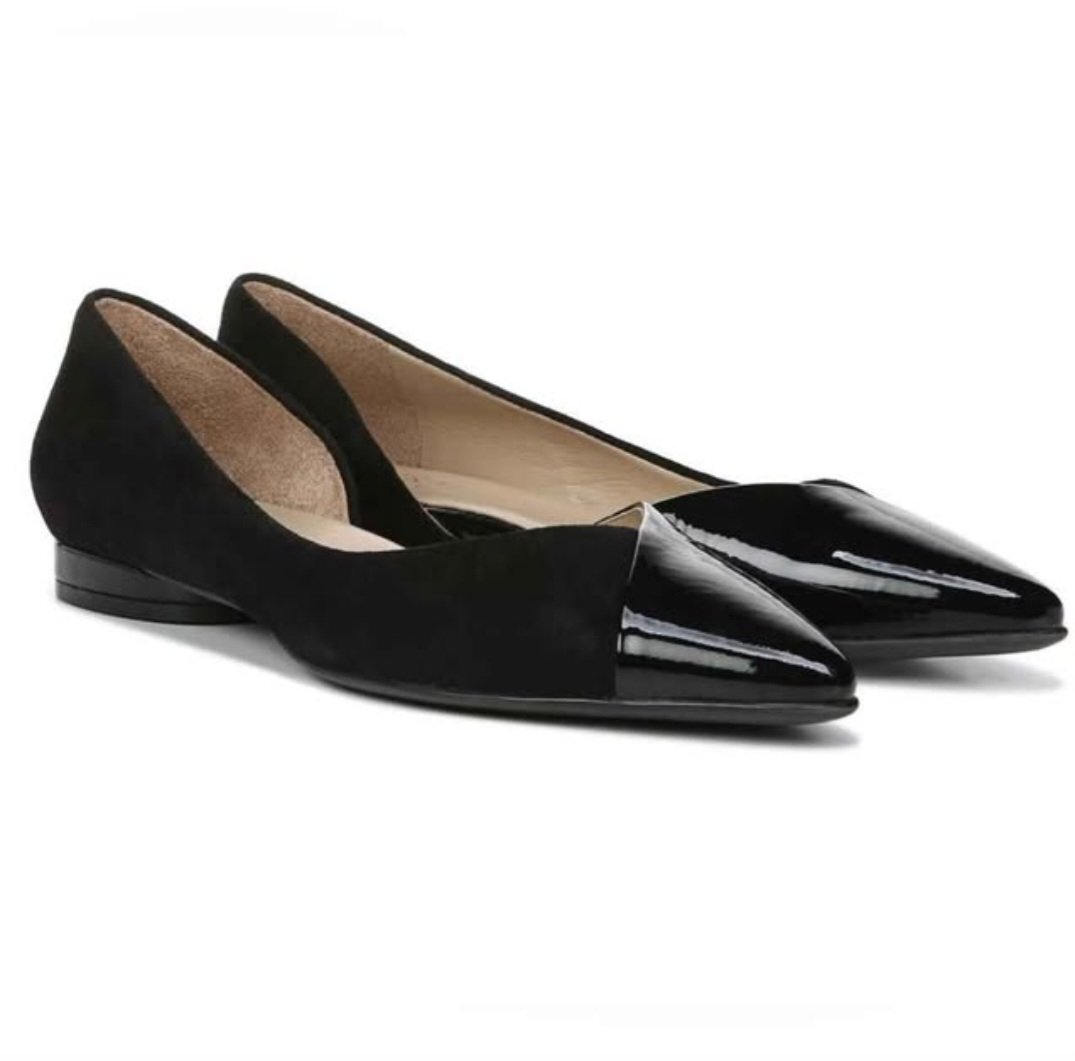 Black pointed toe flat shoes. Features a combination of velour and glossy material. In very good and like new condition.